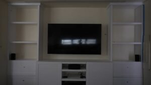 Step 1 was to use my DeWalt laser measuring tape and laser the length from one wall to the other wall in front of the built-ins, which is 136 inches. Half of 136 inches is 68 inches, which I measured from the middle of the room to a side wall and marked it on the floating center console unit. Then I rotated the laser measuring tape upwards and marked the ceiling. That marked the center point of the room and also marked the front of the console unit so that the screen comes down and is almost flush with the front of the console.