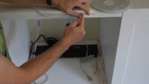 Next, just pull the LED’s adhesive backing off, and stick it to your cabinets. If you’re concerned about the strips or wiring coming loose, you can use these super inexpensive adhesive clips for some extra support like I did under the floating middle section, but for the rest of the install I used hot glue to pin and hide the wires.