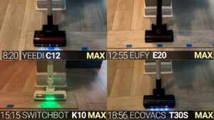 I also tested each vacuum on maximum power settings on a hard surface where the Yeedi lasted just 8 minutes and 20 seconds, the eufy died after 12 minutes and 55 seconds, the SwitchBot lasted 15 minutes and 15 seconds, and the Ecovacs stayed on for a total of 18 minutes and 56 seconds but only maintained maximum power for the first 5 minutes.