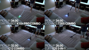 The combo scores were also extremely close with the most expensive Ecovacs T30S coming in first, beating the SwitchBot by one point, the Yeedi C12 was just one point behind that, and the eufy E20 was in last due to its poor stick vacuum performance.