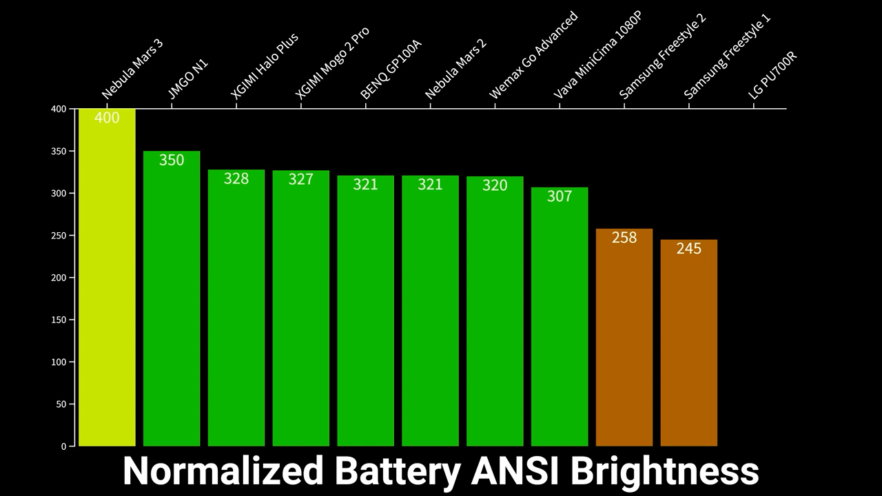 That means that overall, the brightest projectors were the Nebula Mars 3, LG PU700R, and GP100A. While the highest contrast projectors were the JMGO N1, WEMAX Go Advanced, and XGIMI Halo Plus.