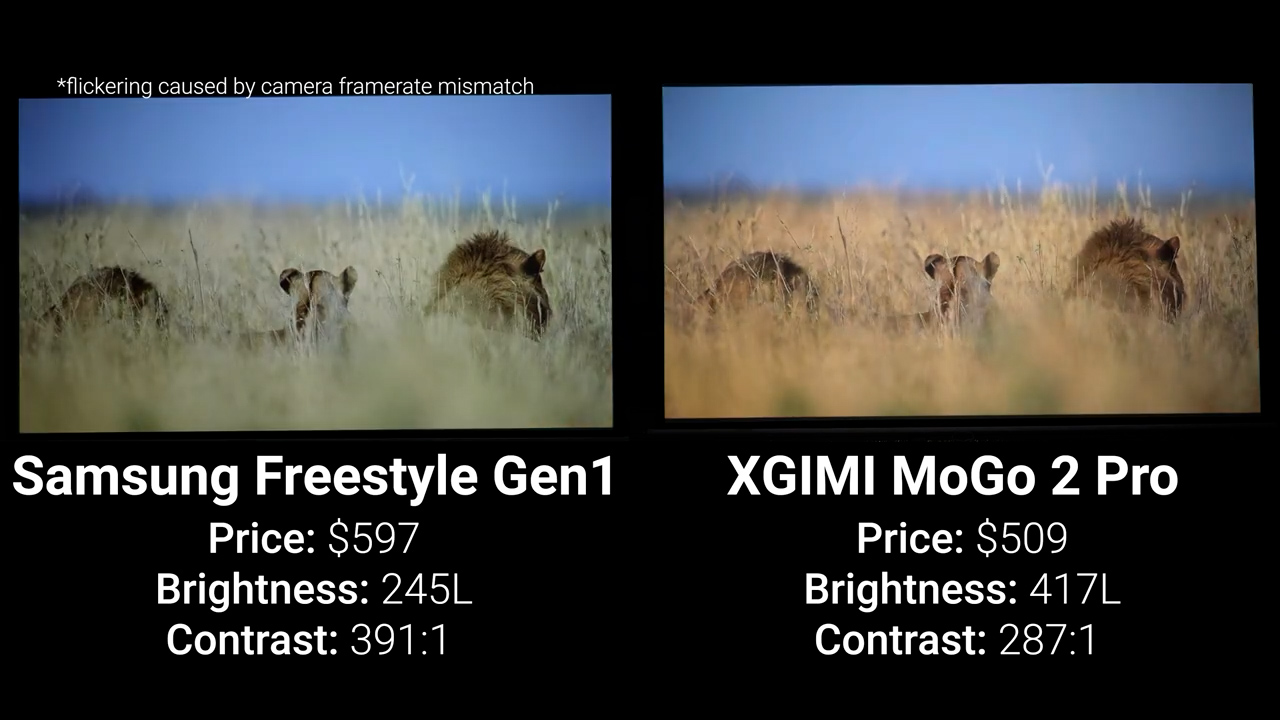 That put the Freestyle Gen 1 on the left up against the Mogo 2 Pro on the right for round 3, and for relatively modern projectors I didn’t think either of them performed particularly well with the Freestyle’s image being over sharpened and over saturated and the Mogo 2 Pro lacking contrast.  The deciding factor was during HDR playback when the tone mapping on the Mogo 2 Pro went crazy on the highlights resulting in terrible color banding and blocking.