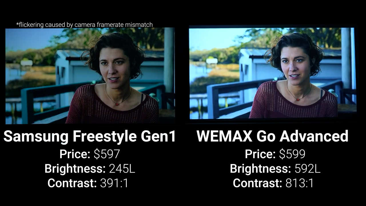 So, the Freestyle Gen 1 on the left moves on to round 4 against the Wemax Go Advanced on the right, and just like last year the Wemax Go Advanced was a breath of fresh air, producing a bright, vibrant, relatively color accurate image with good tone mapping, good contrast, and good clarity. Significantly better than any of the projectors we’ve seen so far, easily beating the Freestyle and moving on.