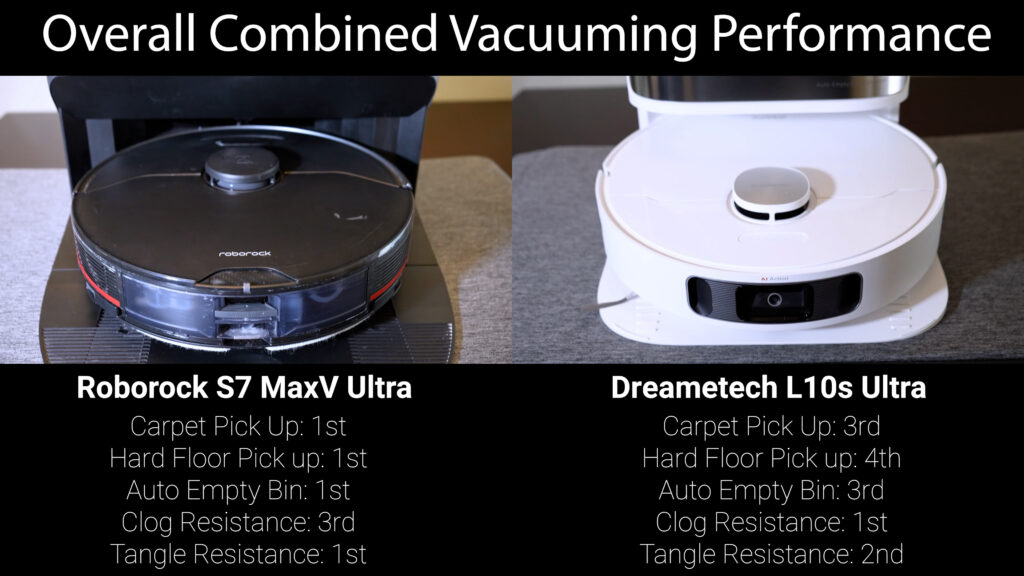So, combining the rankings from the two auto empty tests, the Dreametech L10s has the most capable auto empty system, followed by the Roborock S7 MaxV Ultra and S8 Pro Ultra.