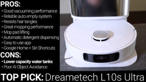 If you’re looking for an all-around great robot that can vacuum every night, do a great job mopping one to two times a week and only needs to be tended to once a month then the DreameTech L10s is probably the right robot for you and my personal choice. I’ll personally be setting up the L10s with three separate schedules: 4 nights a week I’ll have it vacuum the entire house with the mopping pads dry and lifted, then on the other 3 nights I’ll set up two schedules, first it will vacuum the high pile carpet areas, and since the mopping pads should still be completely dry and lifted, there’s no chance of dragging dirty water over the carpet. On those same nights I can set up a second schedule after the carpets are vacuumed and use the cleaning sequence mode to mop all the rooms that don’t have carpet and using this schedule with the capacity of the Dreamebot, I should only need to tend to the clean and dirty water tanks twice a month.