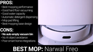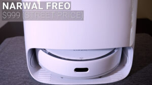 Then, also with a street price around $999 is the Narwal Freo. The Freo has a combination rubber and soft bristle roller for vacuuming, and dual spinning pads for mopping, and like the Dreametech the Narwal can raise its mopping pads when vacuuming carpet or returning to the base station. The Freo uses a top mounted LIDAR unit for mapping but lacks any advanced object avoidance. The Narwal Freo base station doesn’t have automatic emptying for the dustbin but does have large water tanks for automatic mop washing, an automatic mopping solution dispenser, and hot air drying.