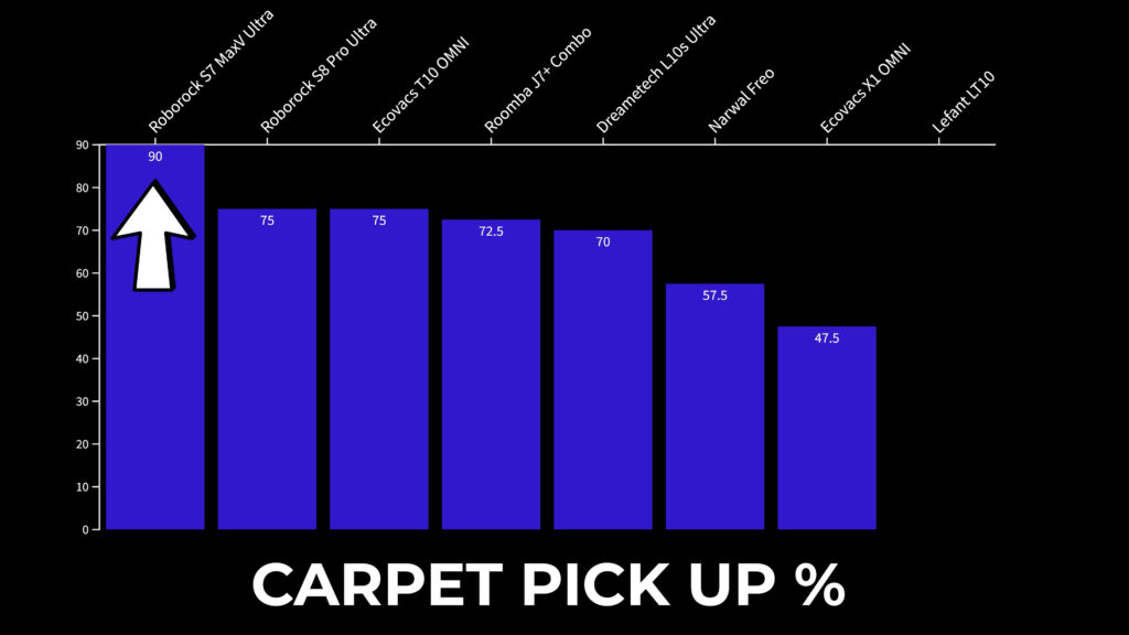The top performer in the carpet pickup test was the Roborock S7 MaxV Ultra, which picked up 36 grams or 90% of the flour, salt, flax seed, and rice mixture. After that the Ecovacs T10 OMNI and Roborock S8 Pro Ultra both picked up 30 grams or 75% of the mixture, then the Roomba J7+ Combo picked up 72.5% and the Dreametech L10s picked up 70%. The Narwal Freo struggled, only picking up 57.5% from the carpet, and the most surprising results were from the Ecovacs X1 OMNI that only picked up 47.5% of the mixture, or 19 grams total, and really struggled to pick up the heavier particles like the flax seed and rice grains.