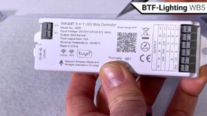 After that, also for a price of $26.99, is the BTF-Lighting WB5, which is a WiFi controller that also uses the Tuya app. The WB5 supports 12V and 24V and has a maximum output of 6A per channel or 15A total and uses press to connect terminals that just barely fit 16 AWG ferrules, or 16 AWG stranded wire, and like the last few controllers we’ve seen the WB5 also lacks any buttons for controlling the strip or terminals to add them.