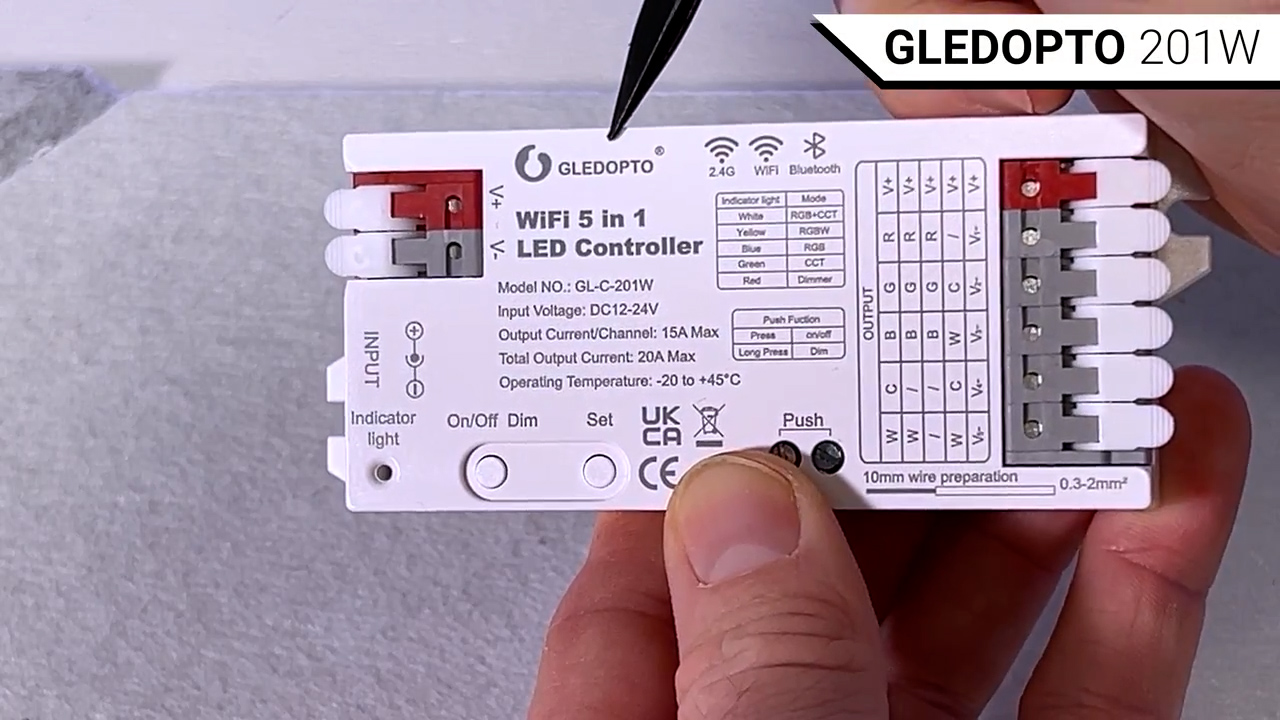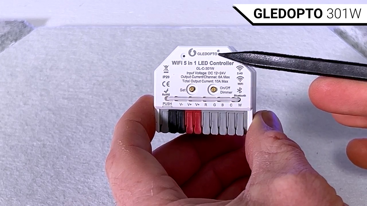 For $15.99 the least expensive controller we’ll be testing is the GLEDOPTO 301W which uses WiFi and the Tuya app for control. The 301W can handle 12V or 24V with a max of 6A on a single channel and 10A total. The 301W has five LED output channels with convenient lever lock style terminals that can fit up to 20 AWG ferrules or 18 AWG stranded wire, a small onboard button that can toggle the light and control dimming, and an extra set of terminals to setup an external push button with the same functionality.
