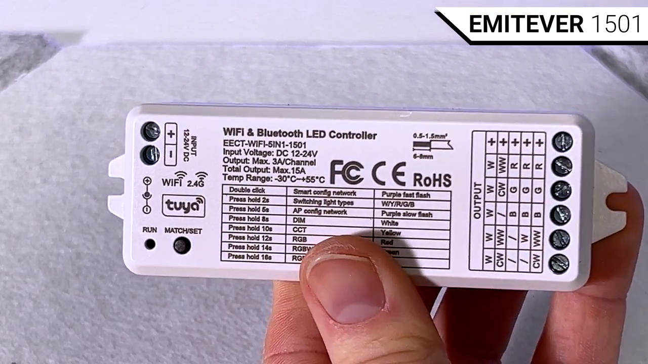 Next for $26.99 is the EMIT EVER 1501, which is another WiFi controller that uses the Tuya app but appears to be a unique design from all the other controllers in the video. The 1501 supports 12V or 24V and has a max of 3A per channel or 15A total. The 1501 has both barrel and screw terminal power inputs and fairly large screw terminal outputs that just barely fit a 14 AWG ferrule or 14 AWG stranded wire and the 1501 has no on board buttons to control the strip nor terminals to add them.
