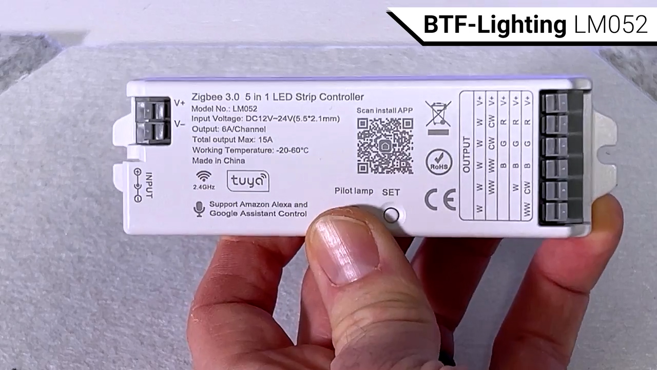 Following up on that, also for $26.99 is the Zigbee version of that same controller which is called the BTF-Lighting LM052 with all the same stats and connections: 12-24V, 6A single channel, 15A total, and press to connect terminals for 16 AWG ferrules and stranded wire.
