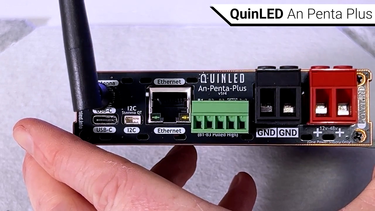Last, if the An-Penta Mini didn’t quite fit your needs, there’s also the $44 An-Penta Plus that triples in size, adds ethernet, and increases the maximum current per channel to 10A or 30A total. The An-Penta Plus also increases the size of the power input terminals to accommodate massive 12 AWG ferrules or 10 AWG stranded wire, and you can double that up to safely feed the board 30A of current. Speaking of safety, in Quindor fashion the An-Penta Mini and An-Penta Plus both have internal fusing on each of the positive outputs. In addition to the larger power inputs, each of the power outputs is also larger and can fit 14 AWG ferrules or 12 AWG wire, and there are power injection outputs for both of the white channels and a total of four positive voltage outputs. On the far side of the board, the An-Penta Plus also includes an output for an addressable LED strip.