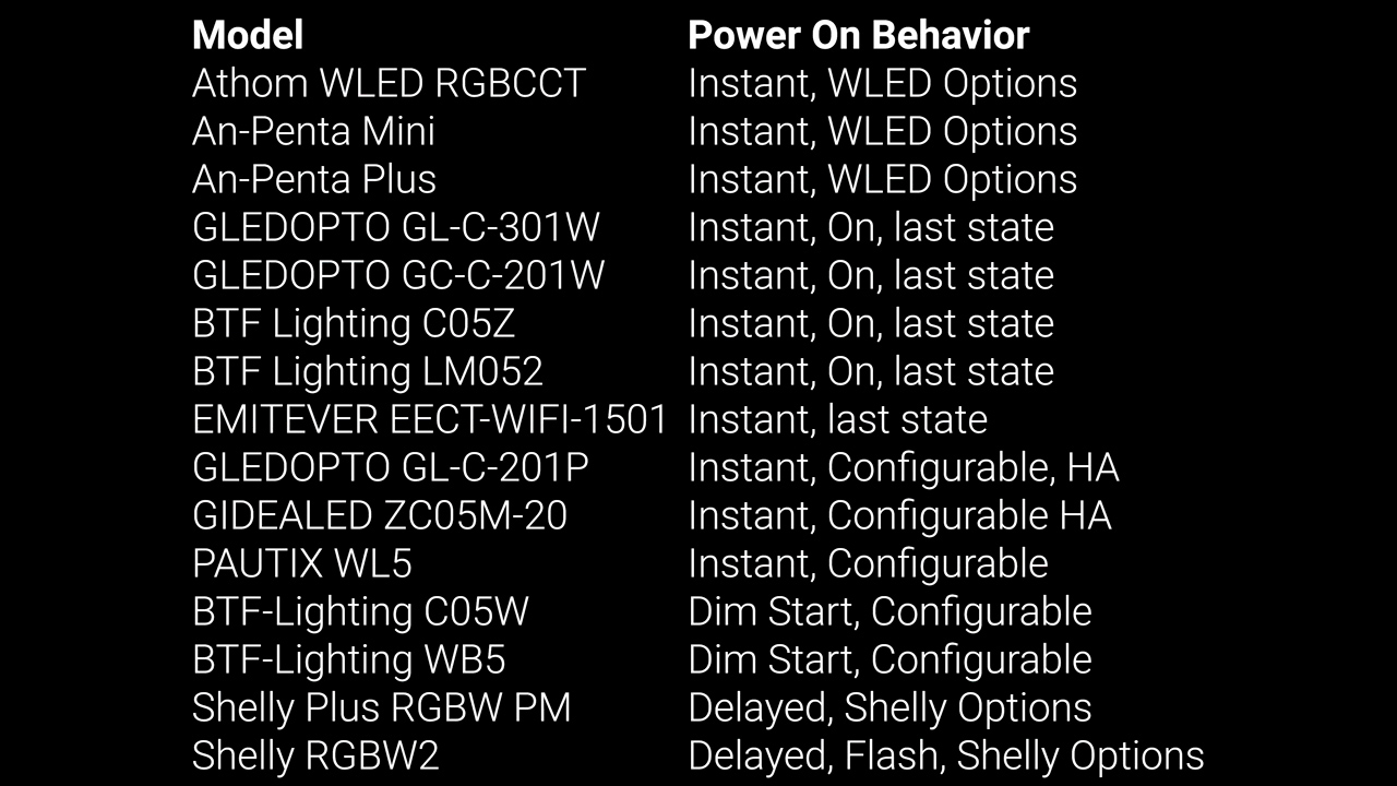 I tested each controller and scoured their respective apps for power on options and found that these 11 controllers started up instantly when powered on, while the BTF Lighting C05W and WB5 power on directly to a dim light for a second before returning to their previous state, the Shelly RGBW2 has a brief flash and then a one second delay before returning to its configured state, and the Shelly RGBW PM has the same one second delay, but doesn’t have the initial flash when it first receives power.