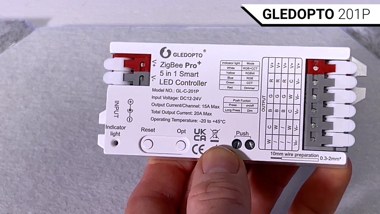 After that, also for $17.99, is the GLEDOPTO 201P, which looks basically identical to the 201W but uses Zigbee instead of WiFi. The 201P has the same current limits at 15A on a single channel or 20A total, it has the same barrel jack connection and lever lock style connectors, but the on/off and dimming button on the 201W has been replaced by a reset button on the 201P that is used to pair it with your Zigbee hub. However, the 201P still has terminals for a push button, which supports push to toggle and hold to dim functions.