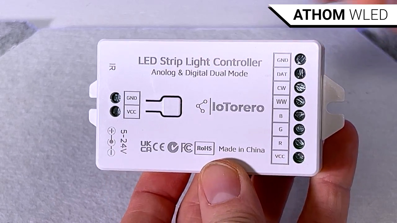 Next for $19.88 is the Athom WLED Analog Strip Controller which as the name suggests is a WiFi controller that uses WLED firmware. The Athom controller accepts voltages from 5-24V and can support up to 16A total. It has both barrel and screw terminal power connections and the more standard screw style terminals can fit up to 14 AWG ferrules or 12 AWG stranded wire. The Athom controller has an onboard button that can be configured in WLED, but no terminals to wire an external button. The Athom controller also has two additional connections: a JST connection for an optional IR remote and an extra data and ground port to connect an addressable LED strip.