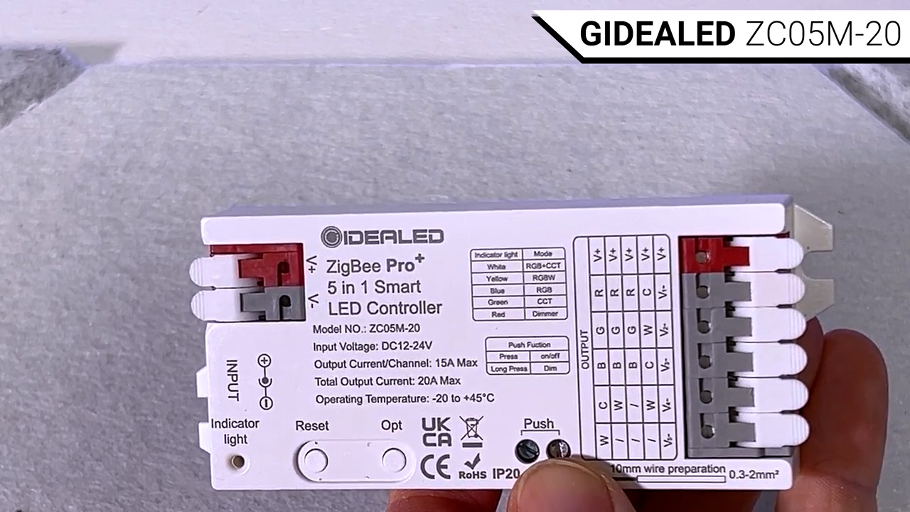 Moving on to the G IDEAL LED ZC05M-20 for $21.99, which is a Zigbee controller that is almost completely identical to the GLEDOPTO 201P as far as terminals, voltage compatibility, and current limits, with both barrel and lever lock style terminals that accept 18 AWG ferrules or up to 14 AWG stranded wire, and screw terminals for an external button.