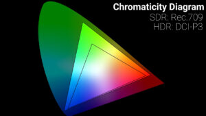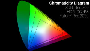 This diagram represents all the colors that your eyes can see, but video content is produced in a much smaller subsection of available colors, which we call a color gamut. Standard Dynamic Range content is mastered in the Rec 709 color space, which is this triangle, while High Dynamic Range content is mastered in the DCI P3 color space, which is this significantly larger triangle. And the newest HDR content can utilize an even larger color space called Rec 2020, though for the time being, movie studios are still mastering content using the DCI-P3 color space, so Rec 2020 is more about future proofing.