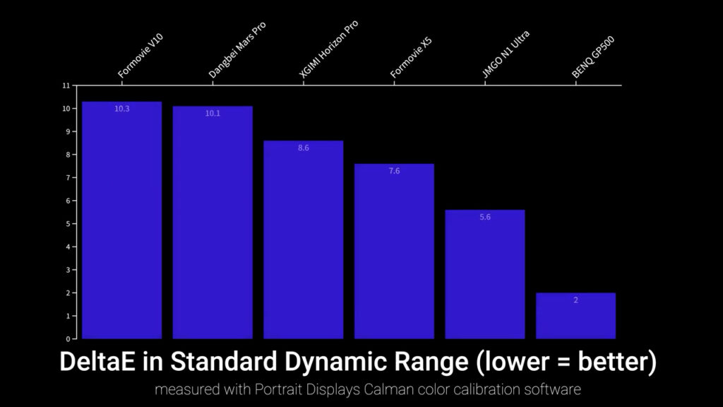 Unfortunately, in this test JMGO came up short, and its most accurate color mode – standard, had an average Delta E in the Rec 709 color space of 5.56, which isn’t terrible, but definitely not under 1. The BENQ GP500 on the other hand had an extremely impressive Delta E of 1.96, which basically means it comes pre-calibrated from the factory, and the worst performers with the least accurate colors were the Formovie V10 and the Dangbei Mars Pro.