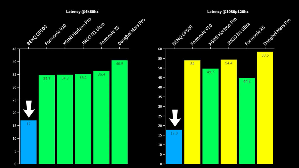At 4K60hz all the projectors had acceptable input lag times under 50ms, but the BENQ was especially impressive at just 17ms, and at 1080p120hz the BENQ remained extremely fast while the rest of the projectors flirted with that 50ms number, making the BENQ GP500 the undisputed king for gaming performance.