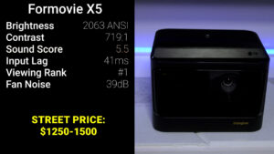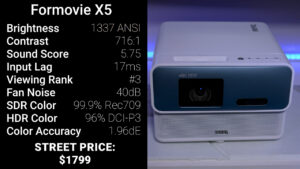 That’s a tough act to follow, but Formovie claims their single laser X5 can produce 4500 ANSI lumens. Unfortunately, in my testing I was only able to measure 2275 ANSI Lumens, which is the 2nd highest behind the JMGO and respectably bright, but only 51% of what it advertised. The X5’s contrast ratio was also the second highest at 892:1, brightness uniformity was 86%, and the X5 drew 142 watts at full power.