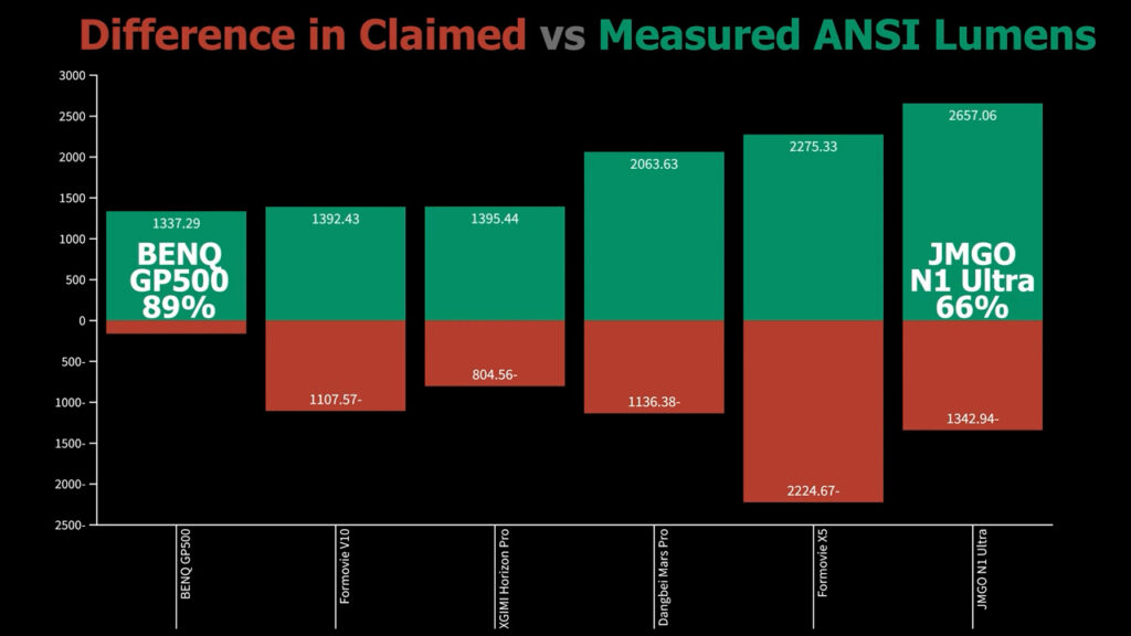 That means that the JMGO was the brightest overall by a significant margin, followed by the Formovie X5 and then the Dangbei Mars Pro. And if we’re giving bonus points for honesty, the BENQ achieved 90% of advertised brightness, while the next closest was the JMGO at 66%, and the Formovie X5 was the least honest at 51% of advertised brightness.