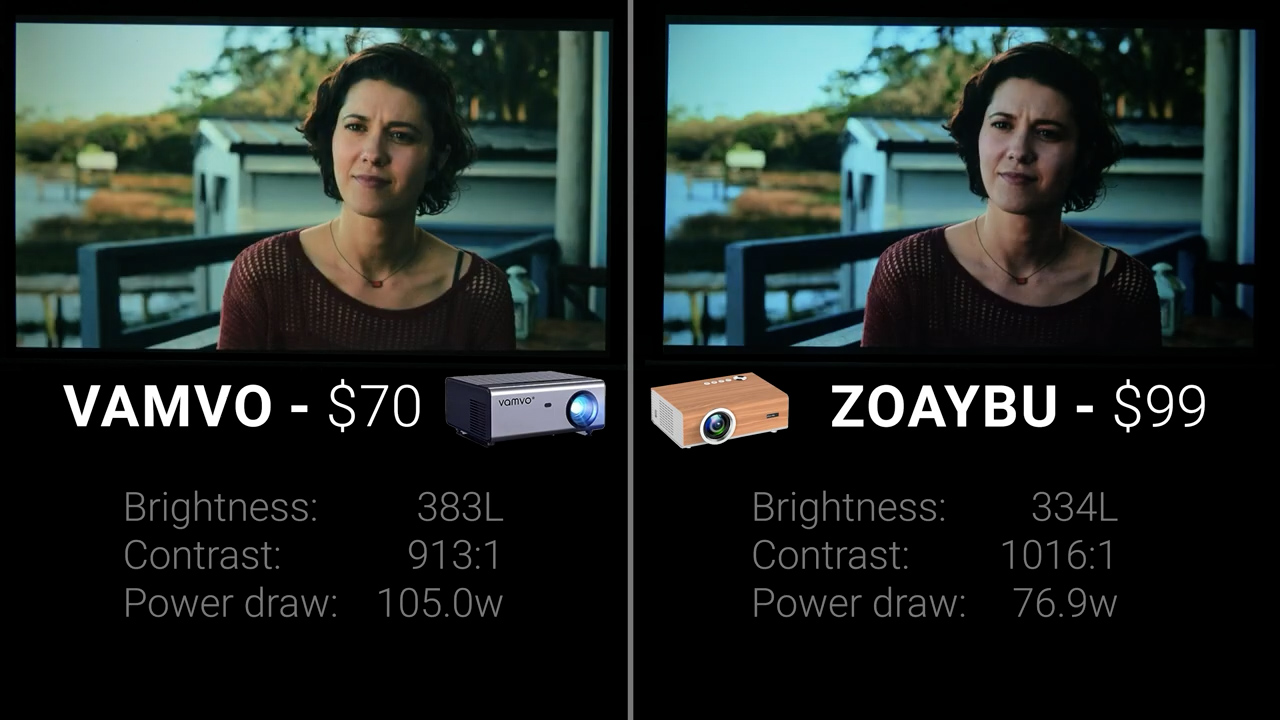 So, the final round of sub $100 projectors was the VAMVO on the left and the $99 Zoaybu on the right, and the Zoaybu is quite a bit more advanced than the rest of the projectors in this video. Not only does it have motorized focus and digital keystone, but it also has respectable brightness with good contrast and judging strictly by the Dolby Atmos test video the Zoaybu was the clear winner, but switching over to Gemini Man reveals some serious issues with the contrast on the Zoaybu being set too high and the brightness set too low, and unfortunately the Zoaybu’s custom picture settings don’t work at all and changing brightness, contrast, and saturation has no effect on the resulting image, which is honestly such a shame because otherwise the Zoaybu would be awesome.