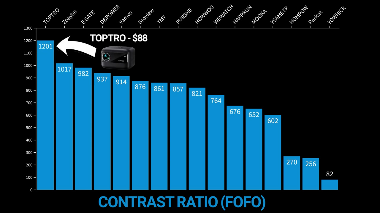 The top contrast ratios were from the TOPTRO at 1201:1, the Zoaybu at 1017:1, and third was the E Gate at 980:1.