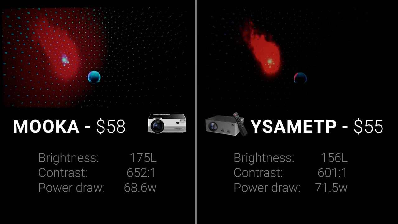Round 1 was the $55 Ysametp on the right vs the $58 MOOKA on the left and even though these two projectors had similar brightness and contrast based on measurements alone, in my side by side testing the MOOKA was clearly better in brightness, color and contrast.