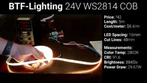 The two addressable RGBW options are called SK6812 strips which come in 5V and 12V varieties and I’ve got the 12V strip from BTF Lighting which is $44 for 5m, and then there’s a newer type called WS2814 which come in 12 and 24V and I got the 12V 5050 LED package which was $30 for 5 meters, and the 24V COB LED style of WS2814 which was $42 for 5m. And for good measure I also included a standard 12V WS2815 RGB strip to compare CRI and efficiency.