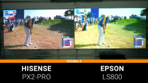 Round 4 then put the Hisense on the left up against the Epson LS800 on the right, and this is what the LS800 was made for, and even though it wasn’t as sharp as the Hisense, the Epson’s brightness was insane, basically twice as bright as the Hisense, so bright that I had to turn the exposure on my camera down to be able to film it. Even with an additional 80 W bank of LEDs directly above the screens the Epson didn’t look washed out at all and still looked excellent.
