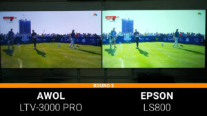 Round 7 put the Ultimea Thor T60 on the left and the AWOL LTV-3500 Pro on the right, and in this round their brightness was nearly identical, so it all came down to sharpness, color and contrast. To me the AWOL’s color was just a little better and the grass didn’t look as neon green, but the most important difference to me was the sharpness where I felt that the AWOL had a distinct advantage over the Ultimea, which almost looked like the white lettering was glowing rather than having crisp edges.