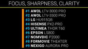 First, if you add up the rankings in each category the overall top performer is the AWOL LTV-3500 Pro with 88 points and it’s definitely a “jack of all trades” projector. It had the best daytime bright room performance, very respectable dark room performance, the 3rd best color gamut coverage, under 20 ms of input lag, the lowest DLP rainbow effect of any projector I’ve ever tested, great focus uniformity, leveling feet, and keystone options, and it supports Dolby Vision and 3D. If you’re just looking for the one all-around best ultra-short-throw projector that’s not likely to let you down in any specific area, that’s the AWOL LTV-3500 Pro.