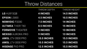 Shorter throws are better because your furniture can be closer to the wall, but longer and taller throws can be useful if you want to mount a soundbar or center channel speaker in between the projector and the screen.