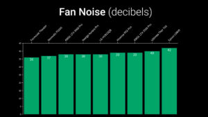 Next let’s talk fan noise, I measured fan noise from one foot from the rear of the projector and found that none of the projectors had problematic fan noise, but the Epson was the loudest at 42 decibels when used on maximum brightness and went down to 38 decibels at 70% brightness. The Ultimea was the next loudest at around 40 decibels. Then the Hisense PX2-Pro at 39 decibels. Then the LTV-3500 Pro at 39 decibels. The LTV-3000 Pro at 38 decibels. The LG HU915QB at 38 decibels. The Nexigo Aurora Pro at 38 decibels. The NOMVDIC P2000 at 37 decibels. And the quietest projector in this lineup was the Formovie Theater at 36 decibels.