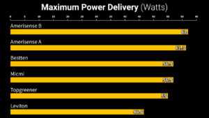 The BESTTEN and Micmi didn’t do as well and only provided 10.8 and 10.9 watts to the USB-C port when a USB-A device was charging at 7.5W, and the Leviton and Top Greener outlets provided the same amount of power to the USB-C port regardless of whether there was a device plugged into the USB-A port, which is the result of their USB-A ports being 5V only and not supporting quick charge.