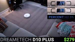 First, the least expensive vacuum in this video is the $279 Dreametech D10 Plus, which until recently was the vacuum that I’d been using for the last two years in my mostly carpeted second floor, but I did get a new D10 Plus for this video so it would be a fair comparison. During the carpet performance test, the Dreametech D10 Plus cleaned for 22 minutes, used 23% of its battery, and picked up 25 grams or 62.5% of the mixture, and after the auto empty process, nearly all the debris had been cleared from the bin.