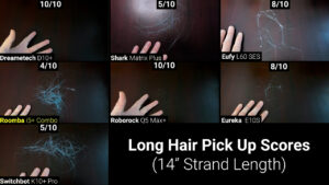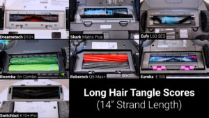 After that are the tangle scores, which are a little more complicated. At first glance the rubber brushes on the Roborock, Roomba, and SwitchBot look like they have almost zero tangles compared to the bristle and hybrid brushes, but in reality, they have almost the same amount of hair wrapped around them, but they are designed to collect hair inside the cavities on either side of the brush instead of on the brush itself. This strategy prevents the decrease in cleaning performance seen in bristle brushes that are wrapped with hair, but you will still need to clear the wrapped hair every 30 to 60 days to keep the brush rolling smoothly.