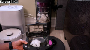 To test the auto empty base’s ability to clear pet hair clogs, I used five stretched and matted cotton balls to fill the vacuum’s bin, and then I triggered a single auto empty cycle and inspected the bin afterwards. And in this first test the Eureka E10S was the only vacuum that failed to completely clear its bin after a single cycle, but it was able to clear the remaining cotton after a second auto empty.
