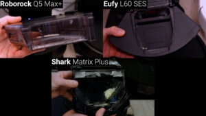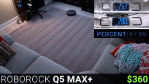 After that is the $360 Roborock Q5 Max+, and the Roborock had a great showing with a lot of similarities to the Dreametech, cleaning for 22 minutes total and using 23% of its battery, but the Roborock had the best pickup score yet cleaning 27 grams total or 67.5% of the mixture, and after the auto empty process the Roborock’s giant bin was almost completely clean and even the filter was mostly free of dust and debris.