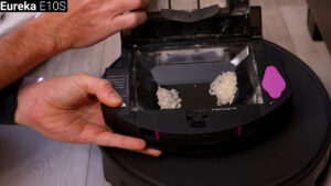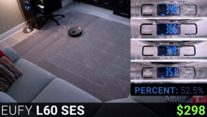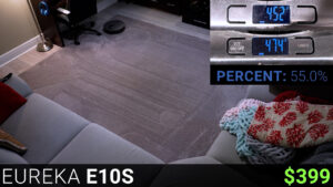 Following that was the $399 Eureka E10S, which cleaned for 36 minutes but only used 20% of its battery which is the best battery efficiency yet. Unfortunately, the vacuuming performance wasn’t great, and it picked up just 22 grams or 55% of the mixture, the same as the Roomba, and also like the Roomba the Eureka still had a decent amount of debris in its bin after the auto empty process.