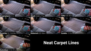 Speaking of which, something that I personally love is waking up in the morning to fresh neat carpet vacuuming lines, and you can see that the Dreametech had by far the straightest and most uniform lines followed by the Roborock, SwitchBot, and Shark. The Eureka and eufy were okay, but they seemed to clean in random areas near the end of the cycle which messed up the overall neat lines, and the Roomba was definitely the worst with a lot of crooked lines and random pathing.