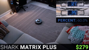 Next, also for $279, sort of, is the Shark Matrix Plus. I say sort of because I picked up this vacuum off the shelf from Costco for $279, but when I was at Best Buy, I noticed that the same vacuum was $399 and on Amazon this model is only available as refurbished for $179. The Shark vacuumed the carpet for 30 minutes and used around 50% of its battery while picking up slightly less debris than the Dreametech at 24 grams or 60% of the mixture and after the auto empty process the Shark’s bin was completely clean but the non-removable filter was pretty clogged with flour and carpet fluff.