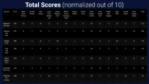 Here are all the scores normalized, grouped, and totaled and when it comes to pure cleaning performance the Roborock Q5 Max+ is the clear winner with the best carpet and hard floor pickup, best hair pickup and tangle avoidance, a nearly perfect auto empty score, and the best path planning and shortest overall cleaning time making it without question the best vacuum you can get under $400.