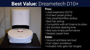 However, if you divide the total points by the price of the vacuum the best value is the Dreametech D10+, which again had very respectable carpet and hard floor performance, great path planning, and a perfect auto empty score, and it costs nearly 25% less than the Roborock at just $279.