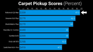 So that means that the best carpet pickup score was the Roborock Q5 Max+ with 67.5%, followed by the two least expensive vacuums the Dreametech D10+ in second at 62.5%, and the Shark Matrix in third at 60%.