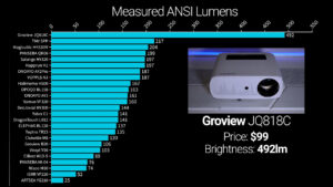 If you want the brightest option under $100, that’s the Groview JQ818C which is over two times brighter than the next brightest projector and consequently finished first in the side-by-side testing. The Groview also had the loudest speakers and acceptable input lag numbers for gaming. But all that brightness comes at a cost, because the fan is louder than most at 48.4 decibels and the Groview is roughly three times as big and uses 3x as much power as the rest of the projectors in the video. Still, almost 500 ANSI lumens for $99 is pretty incredible.