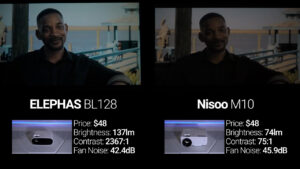 Which made round 5 the ELEPHAS BL128 on the left and Nisoo M10 on the right, and while not quite as bad as the ARTSEA from round 1, the Nisoo was pretty terrible with just 74 ANSI lumens, and an incorrect aspect ratio that squished the entire image vertically, and this round wasn’t close.
