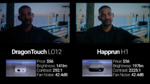 So round 12 was the iGRR V220 on the left and the Happrun H1 on the right, and the fact that a 52 lumen 480p projector costs more than the Happrun makes you realize how impossible it is for the average consumer to pick a projector. In addition to poor brightness, bad color, and low resolution, the V220 also didn’t display the aspect ratio properly.