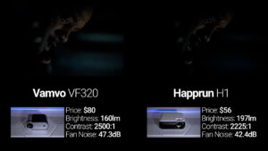 And that made round 20 the Vamvo VF320 on the left and the Happrun H1 on the right. In bright scenes the Vamvo was slightly less saturated than the Happrun, but I felt like that actually led to a little bit better color accuracy. I was also impressed by the sharpness of the VF320 which very confusingly is a 720p native projector, so you wouldn’t expect great sharpness. But it seemed to show more detail in faces and skin without looking bumpy like the Yaber a few rounds earlier, and in dark scenes the VF320 had great color and great highlights, and I would have never expected a 720p projector to take down the Happrun after 14 rounds, but I think the Vamvo earned the win.