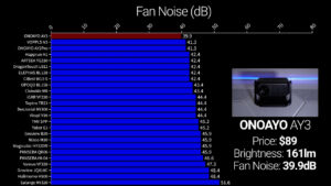 Another issue that these cheap projectors struggle with compared to more expensive ones is fan noise since projecting a 15000 lumen light source through an LCD screen that absorbs 97% of the light generates a lot of heat. I measured each projector’s fan noise from a distance of 12” and found that the quietest was the $89 ONOAYO AY3 with a fan noise of 39.9 dB, but some other notably decent performers were the VOPLLS N3, ONOAYO AY2Pro, and Happrun H1 which had high lumens but low fan noise. The loudest projector was the extremely popular HY320 series that is all over the TikTok store which came in at an overwhelming 51.6 decibels.